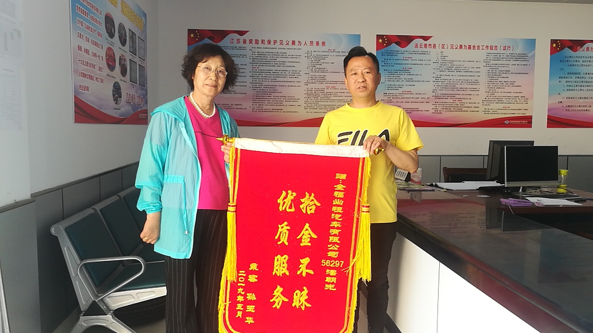 5月28日下午,市民孫女士來到全福公司服務(wù)中心送來一面錦旗,表揚(yáng)蘇G56297副駕潘朝光“拾金不昧、優(yōu)秀服務(wù)”先進(jìn)事跡。