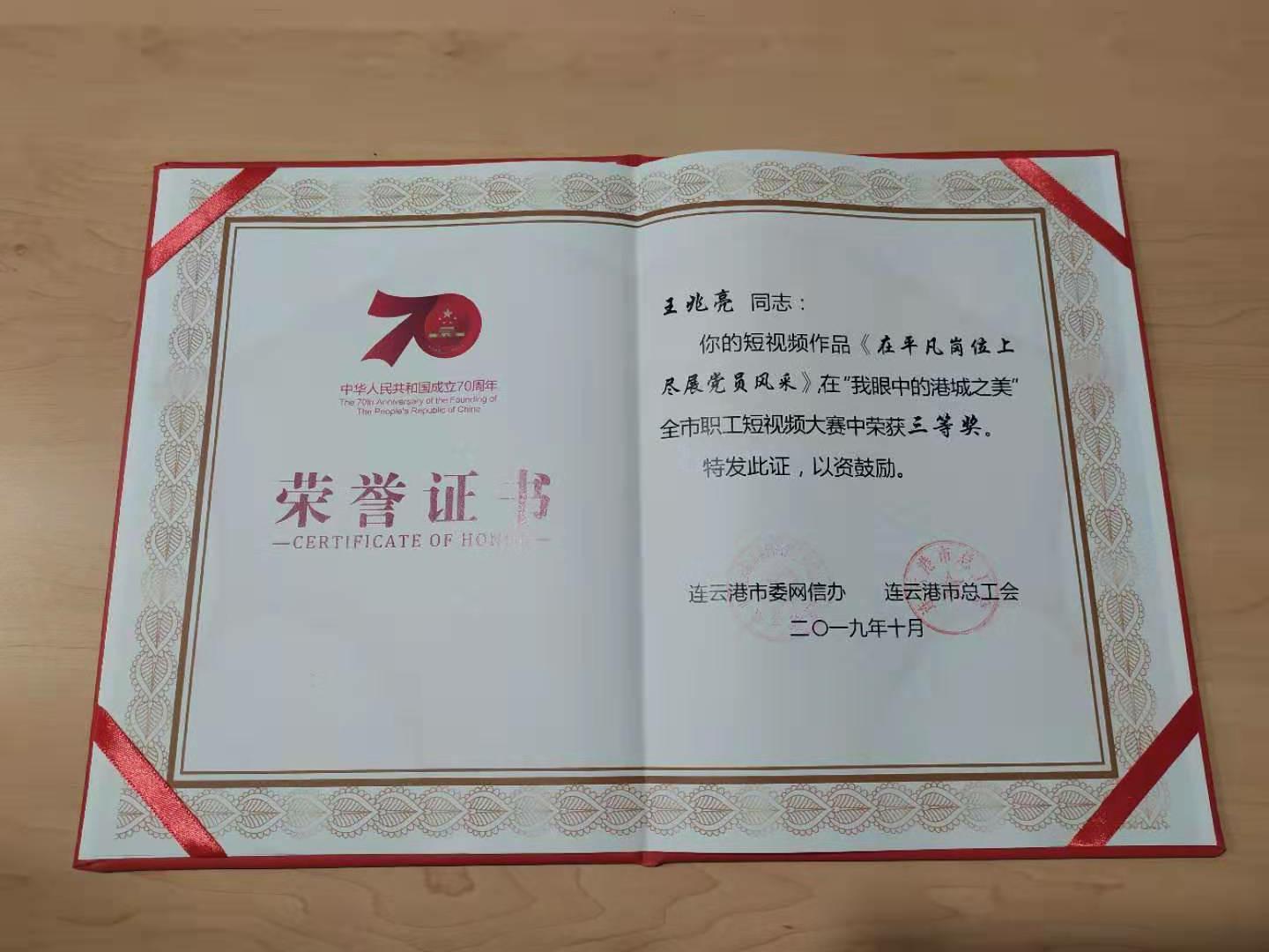 2019年是新中國成立70周年,為了充分展示新中國成立70周年以來連云港市取得的輝煌成就和創(chuàng)建全國文明城市的豐碩成果,同時,也為了進一步提升連云港市職工網(wǎng)絡文化品質(zhì),滿足廣大職工網(wǎng)民日益增長的精神文化需求,構建清朗的網(wǎng)絡空間,為連云港經(jīng)濟社會發(fā)展營造良好的網(wǎng)絡輿論環(huán)境,市委網(wǎng)信辦、市總工會于6月中旬聯(lián)合開展全市職工慶祝新中國成立70周年——“我眼中的港城之美”網(wǎng)絡主題宣傳活動。修理公司王兆亮同志選送的短視屏《在平凡崗位上盡展黨員風采》在“我眼中的港城之美”全市職工短視頻大賽中榮譽三等獎。