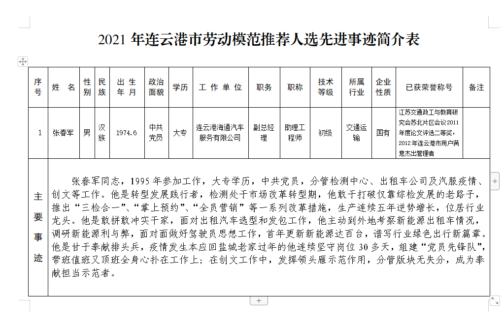附件:2021年連云港市勞動模范推薦人選先進事跡簡介表