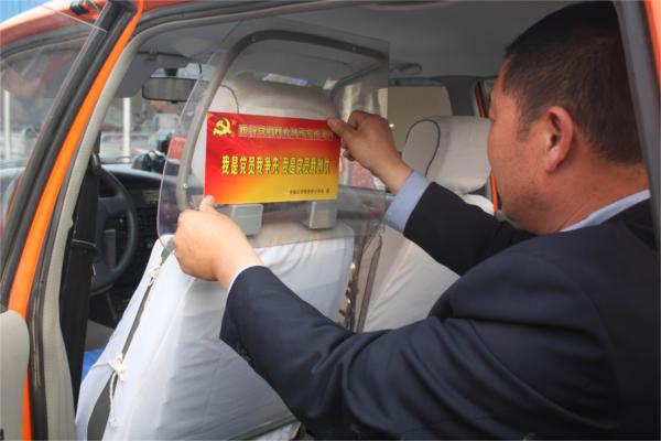 并在黨員的士車內(nèi)張貼“我是黨員我爭先、我是黨員我創(chuàng)優(yōu)”活動(dòng)標(biāo)語。