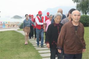 老人們在“黨員的士”志愿者的攙扶下穿過綠陰緩緩步入在海一方公園,踏著柔軟的細(xì)沙,伴隨著海潮深深地被大自然的海景所吸引。龔鳳霞老人說:“現(xiàn)在我站在海邊就如做夢一樣,雖然我在連云港生活了這么多年,來海邊看海還真是第一次,以前只是在電視上看過大海,今天我看著海潮、聽著海浪在好心人的陪伴下我真的感到很知足。”說著說著她不由自主地唱起了“大海啊,故鄉(xiāng)”這支歌,在她的帶動下老人們都附和著唱了起來,臉上流露出童真般的笑容。