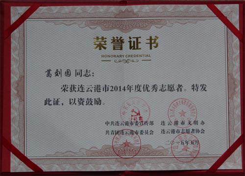5月14日,借連云港市志愿者協(xié)會(huì)第三次會(huì)員代表大會(huì)召開(kāi)之際,連云港市委宣傳部、市文明辦、團(tuán)市委、市志愿者協(xié)會(huì)對(duì)2014年度優(yōu)秀志愿者、優(yōu)秀志愿服務(wù)組織進(jìn)行表彰,連汽出租公司“雷鋒的士”車隊(duì)榮獲“2014年度優(yōu)秀志愿服務(wù)組織”榮譽(yù)稱號(hào),葛劉園榮獲“2014年度優(yōu)秀志愿者”榮譽(yù)稱號(hào)。