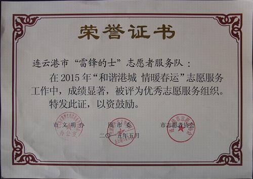 6月中旬,連汽出租公司“雷鋒的士”車(chē)隊(duì)被連云港市文明辦、共青團(tuán)連云港市委員會(huì)、連云港市志愿者協(xié)會(huì)聯(lián)合授予2015年連云港市春運(yùn)優(yōu)秀志愿服務(wù)組織獎(jiǎng),趙亮、葛劉園2人被授予連云港市“和諧港城 情暖春運(yùn)”優(yōu)秀志愿者。