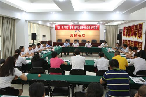 8月19日下午,由海通集團(tuán)權(quán)屬單位公交公司、汽服公司、汽車公司組織開展的踐行“三嚴(yán)三實(shí)”要求、擦亮優(yōu)質(zhì)服務(wù)品牌研討交流會(huì)在公交公司三樓會(huì)議室舉行,市文明辦副主任劉永鑫、海通集團(tuán)董事長、黨委書記劉永能,汽服公司總經(jīng)理趙士強(qiáng)、黨委書記劉元祥、工會(huì)主席趙明及三家單位主要領(lǐng)導(dǎo)、2014年度最美海通人及提名獎(jiǎng)獲得者、“黨員的士”、“雷鋒的士”代表近40余人參加了會(huì)議,集團(tuán)紀(jì)委書記趙煦主持會(huì)議。