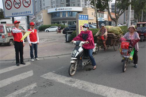 25日下午3點(diǎn),參加活動(dòng)的團(tuán)員青年們身著紅色馬夾,手拿印有”文明交通 文明出行“字樣的的小旗,早早站在了解放路與郁州路交叉的十字路口。參與活動(dòng)的青年團(tuán)員志愿者們主動(dòng)協(xié)助交巡警開(kāi)展文明勸導(dǎo),提醒過(guò)往行人注意交通信號(hào)燈,對(duì)行人、非機(jī)動(dòng)車(chē)隨意橫穿馬路、闖紅燈等不文明行為進(jìn)行勸阻,給那些過(guò)馬路有困難的老人和孩子提供幫助,并向過(guò)往行人宣傳交通安全知識(shí)。