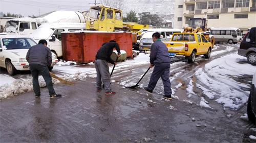 2015年1124日,今冬第一場(chǎng)大雪初降連云港,雪越下越大,城市漸漸被大雪籠罩。下午連云轎車(chē)修理廠接到汽服公司《關(guān)于做好雨雪冰凍天氣安全生產(chǎn)工作的緊急通知》,根據(jù)通知內(nèi)容要求,史海剛廠長(zhǎng)立即組織共青團(tuán)員清掃廠區(qū)內(nèi)積雪,確保進(jìn)出車(chē)輛暢通無(wú)阻。接著,要求安全科對(duì)廠內(nèi)的公務(wù)車(chē)輛進(jìn)行檢查,及時(shí)添加防凍液。最后教育廠車(chē)駕駛員在上下班途中一定要注意行車(chē)安全。