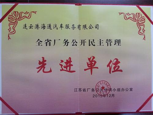 12月,汽服公司喜獲2015年度全省“廠務(wù)公開(kāi)民主管理先進(jìn)單位”榮譽(yù)稱號(hào)。該項(xiàng)榮譽(yù)是對(duì)企業(yè)廠務(wù)公開(kāi)民主管理工作的充分肯定。