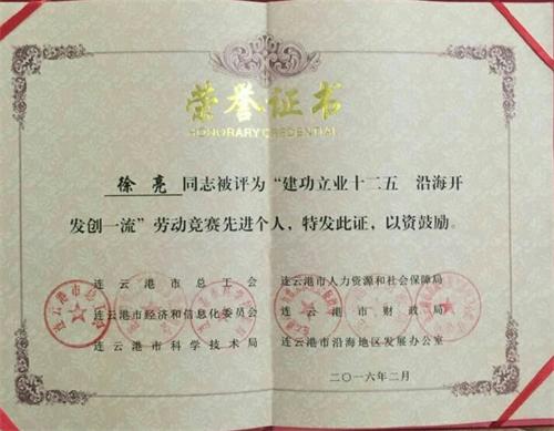 在國家“十二、五”經(jīng)濟(jì)建設(shè)活動中,涌現(xiàn)出了許許多多創(chuàng)先爭優(yōu)、建功立業(yè)、團(tuán)結(jié)協(xié)作、積極奉獻(xiàn)的先進(jìn)個人和感人事跡。為樹立典型,表彰先進(jìn),2015年底,連云港市總工會等6家單位聯(lián)合開展“建功立業(yè)十二五,沿海開發(fā)創(chuàng)一流”勞動競賽評比活動。經(jīng)企業(yè)上報、上級單位推薦,市勞動競賽領(lǐng)導(dǎo)小組審批,修理公司徐亮同志被評為“建功立業(yè)十二五、沿海開發(fā)創(chuàng)一流”先進(jìn)個人榮譽(yù)稱號。