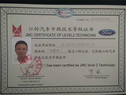 修理公司孫愛(ài)兵順利通過(guò)江鈴二級(jí)技師認(rèn)證
