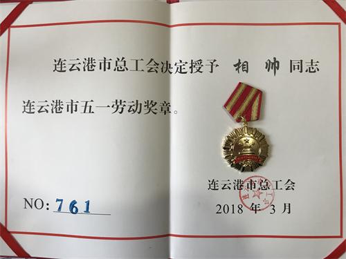2018年3月,為表彰他在技能競(jìng)賽中取得的優(yōu)異成績(jī)和在汽車維修行業(yè)所做出的貢獻(xiàn),連云港市總工會(huì)授予相帥同志市五一勞動(dòng)獎(jiǎng)?wù)隆?/span>